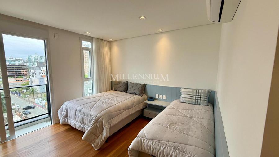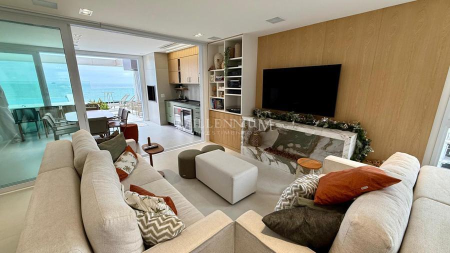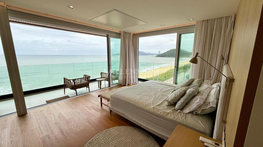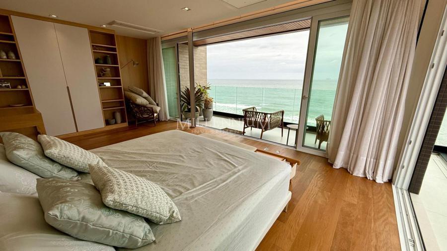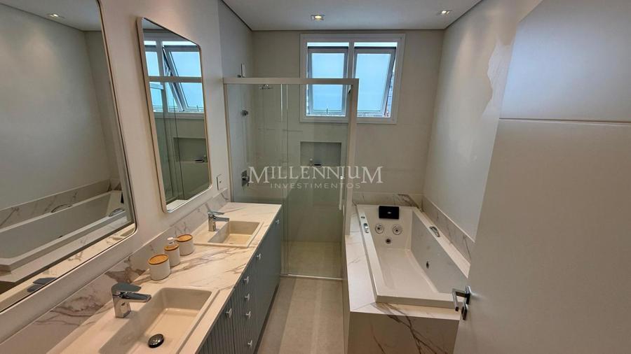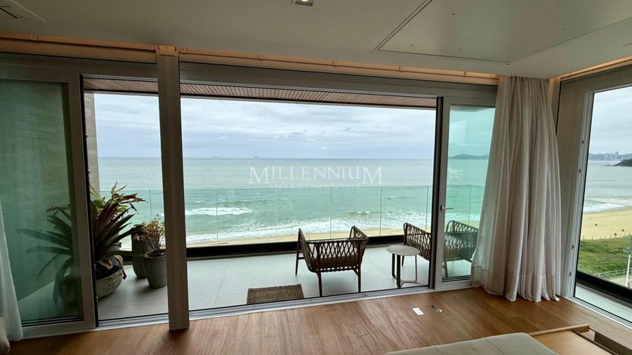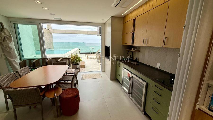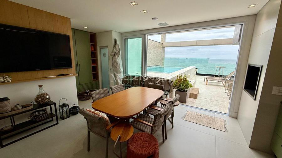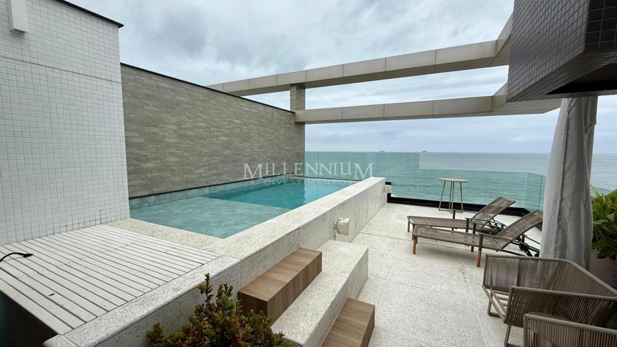 Cobertura Duplex na Praia Brava em Itajaí com 450m² privativos, 04 suítes sendo 02 suíte máster com closet e hidromassagem, lavabo, living integrado com sala de estar e sala de jantar, sala de TV, sacada, cozinha, churrasqueira à carvão, piscina aquecida privativa, sauna, lareira, área de serviço e 04 vagas de garagem.