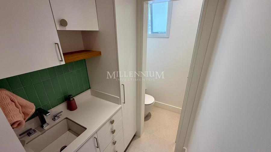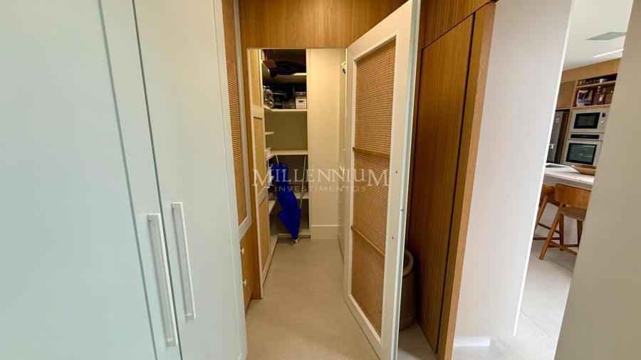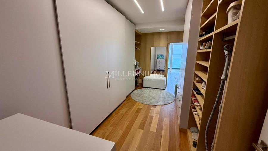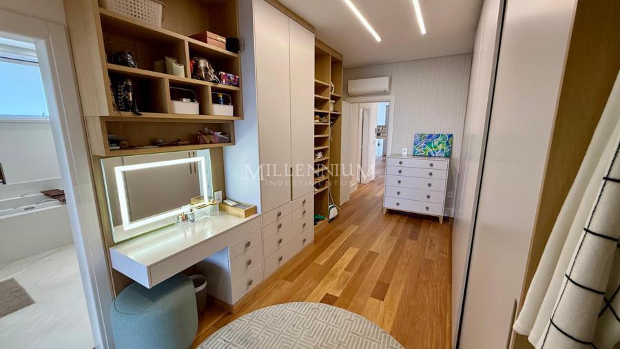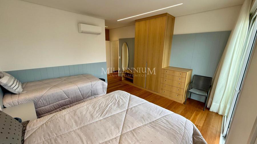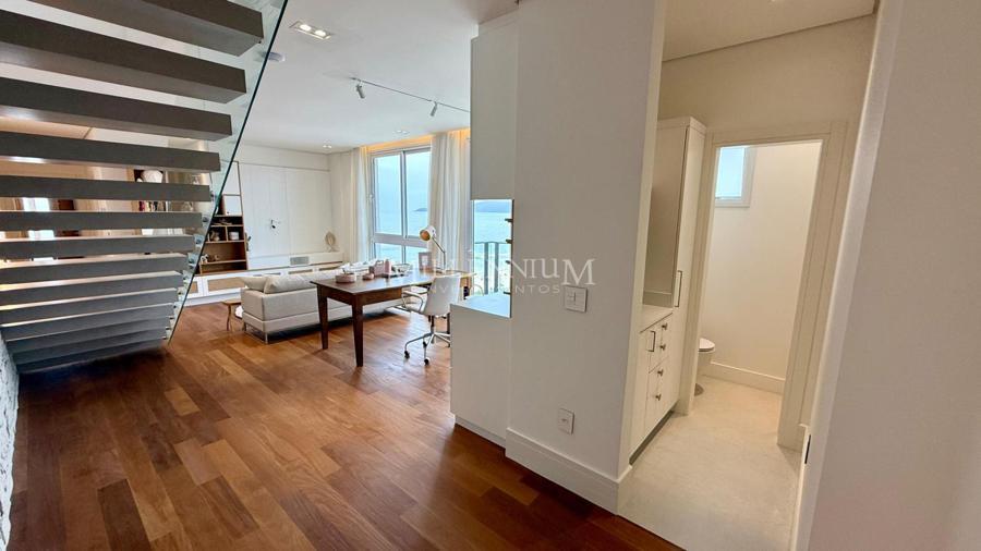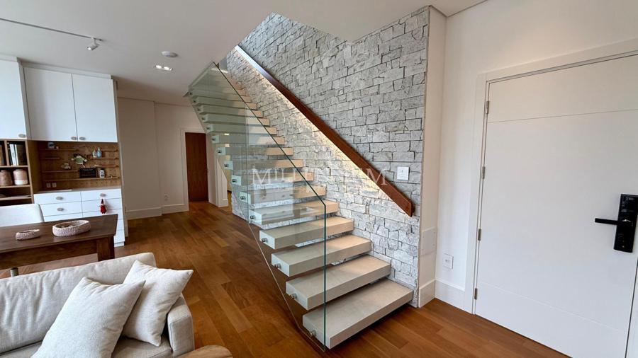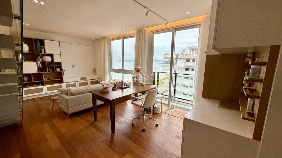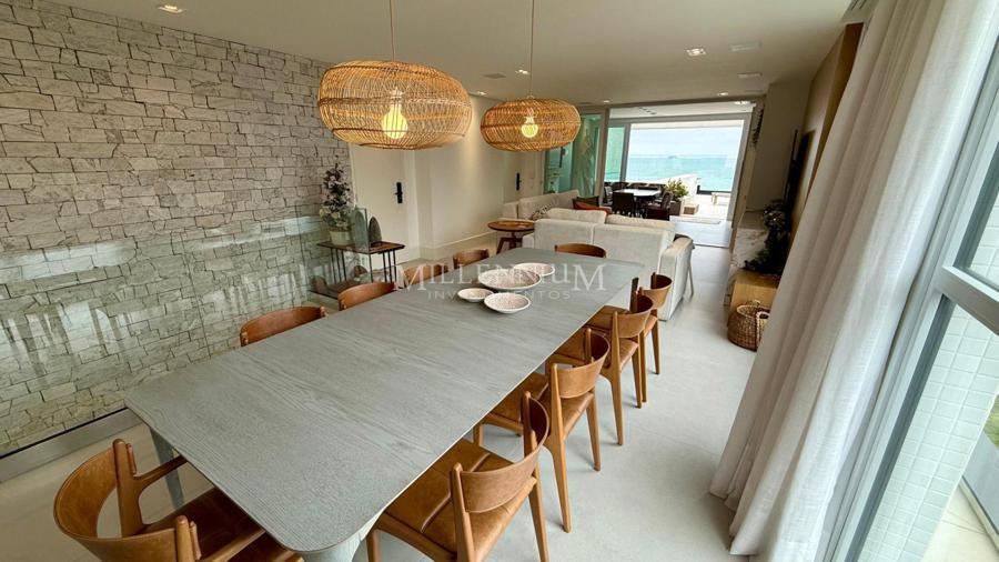 Cobertura Duplex na Praia Brava em Itajaí com 450m² privativos, 04 suítes sendo 02 suíte máster com closet e hidromassagem, lavabo, living integrado com sala de estar e sala de jantar, sala de TV, sacada, cozinha, churrasqueira à carvão, piscina aquecida privativa, sauna, lareira, área de serviço e 04 vagas de garagem.