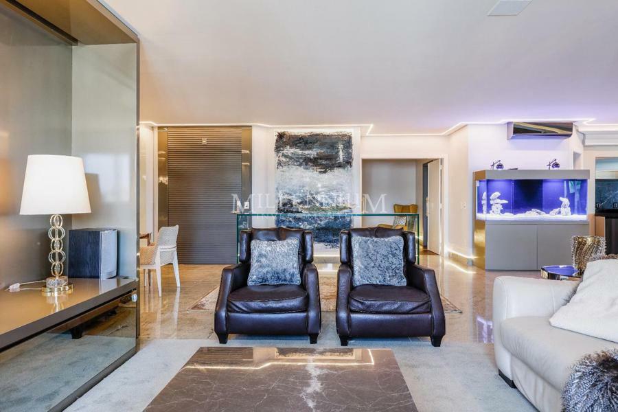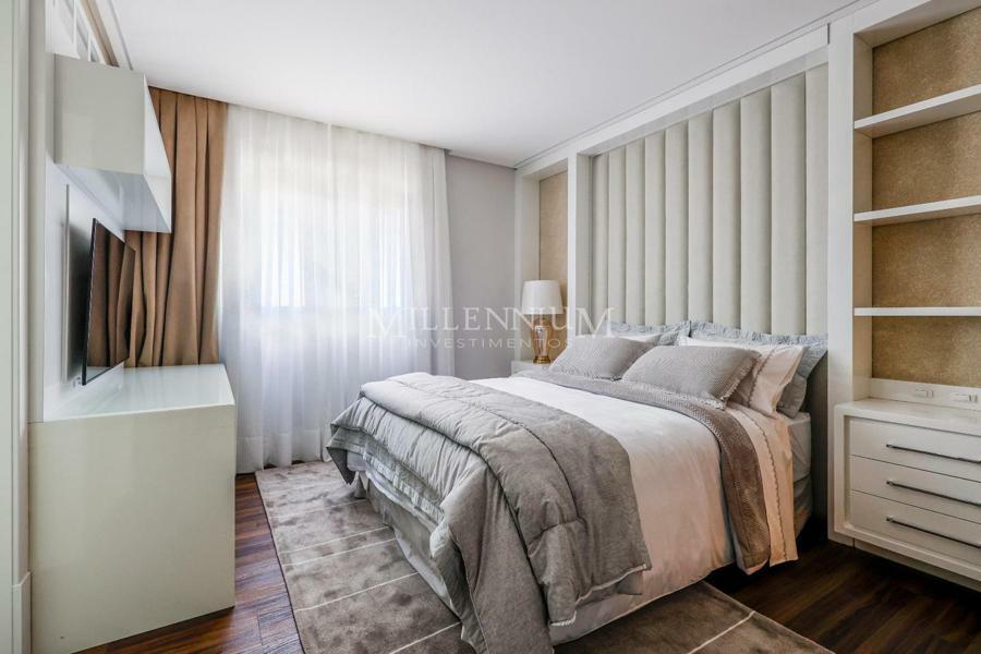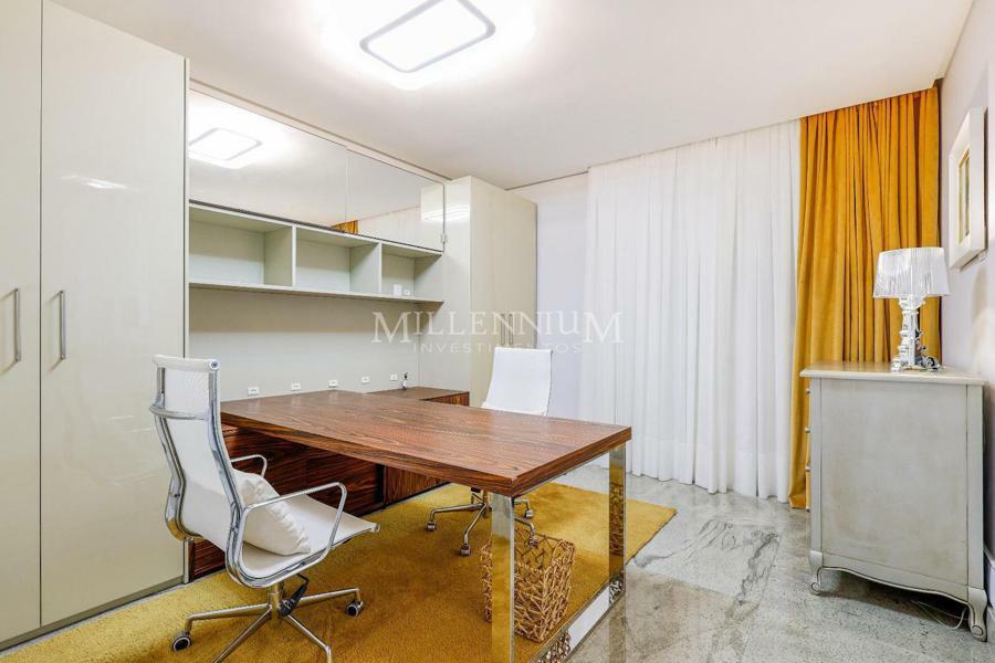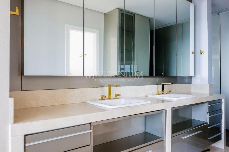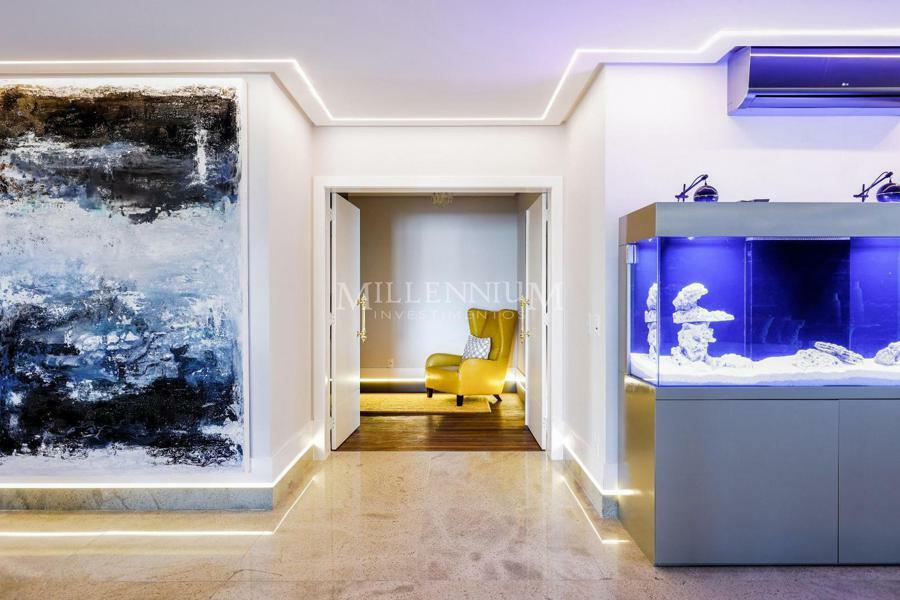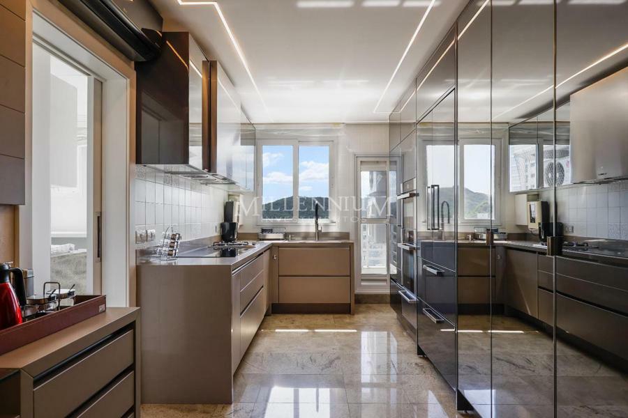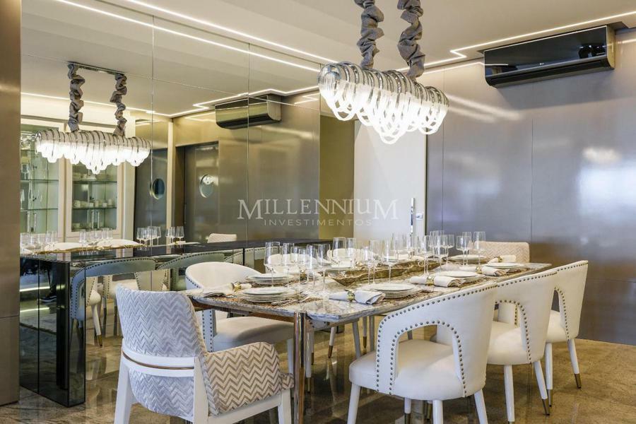 Totalmente mobiliado, equipado e decorado, o imóvel apresenta acabamentos de alto padrão, com peças assinadas por Breton, Florence (laqueados), Jader Almeida e Natuzzi — sinônimo de bom gosto e qualidade. A automação Lutron traz tecnologia e praticidade ao cotidiano, permitindo o controle inteligente de iluminação e ambientes. A cozinha é completa, com área de serviço independente, dependência de empregada e lavabo social. Para completar, o apartamento dispõe de 6 vagas de garagem e depósito privativo.