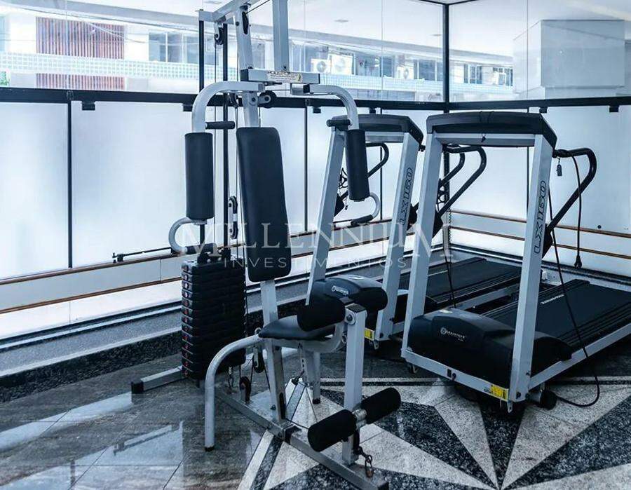 Condomínio com piscina, salão de festas e academia.